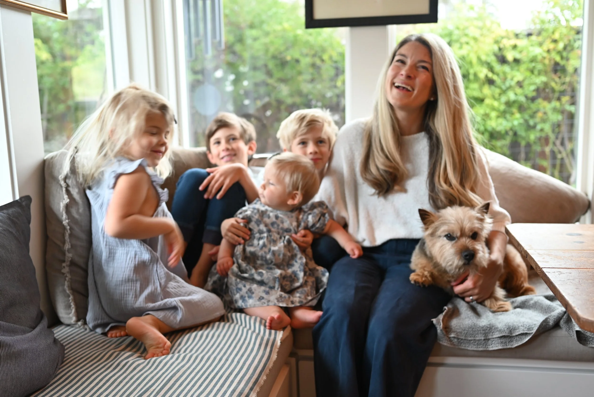 A woman and four children sitting on a window seat with a dog, smiling and laughing together.