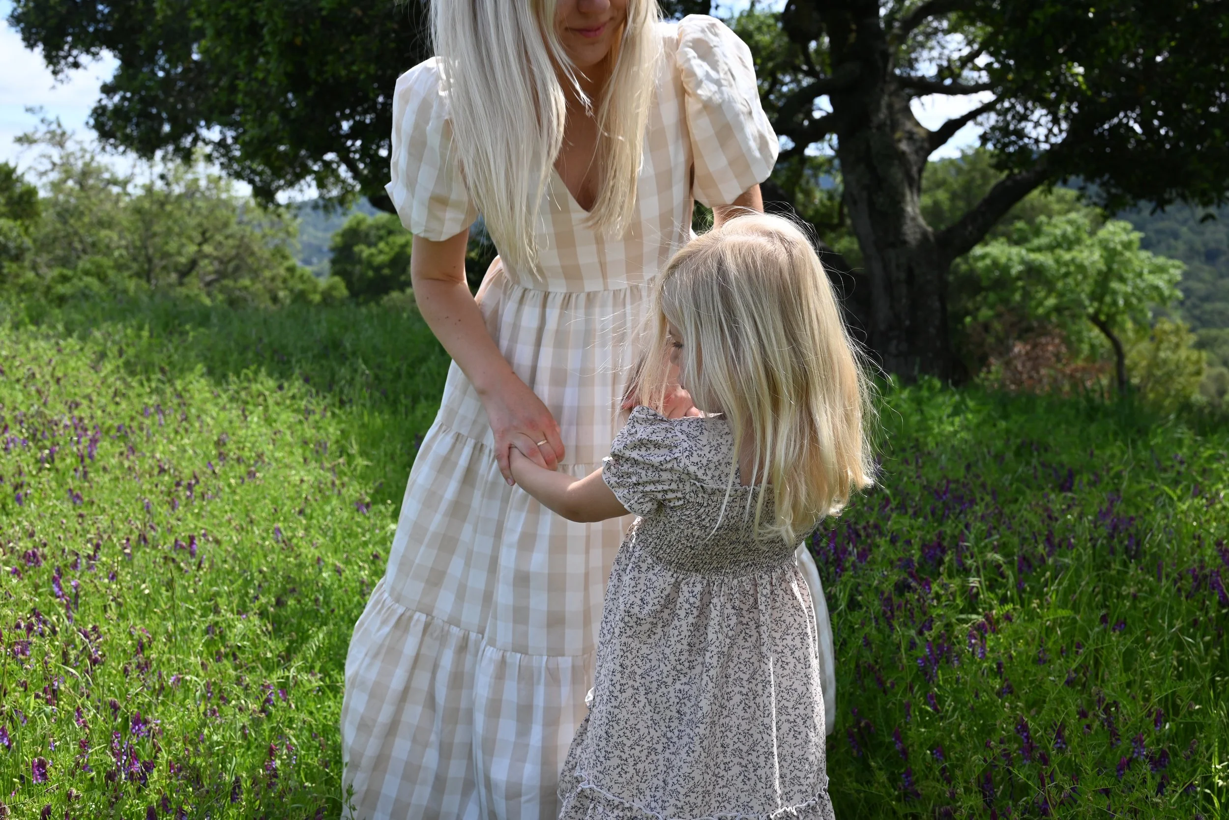 A woman and a young girl holding hands in a grassy field with purple flowers, trees, and a mountain in the background on a sunny day.