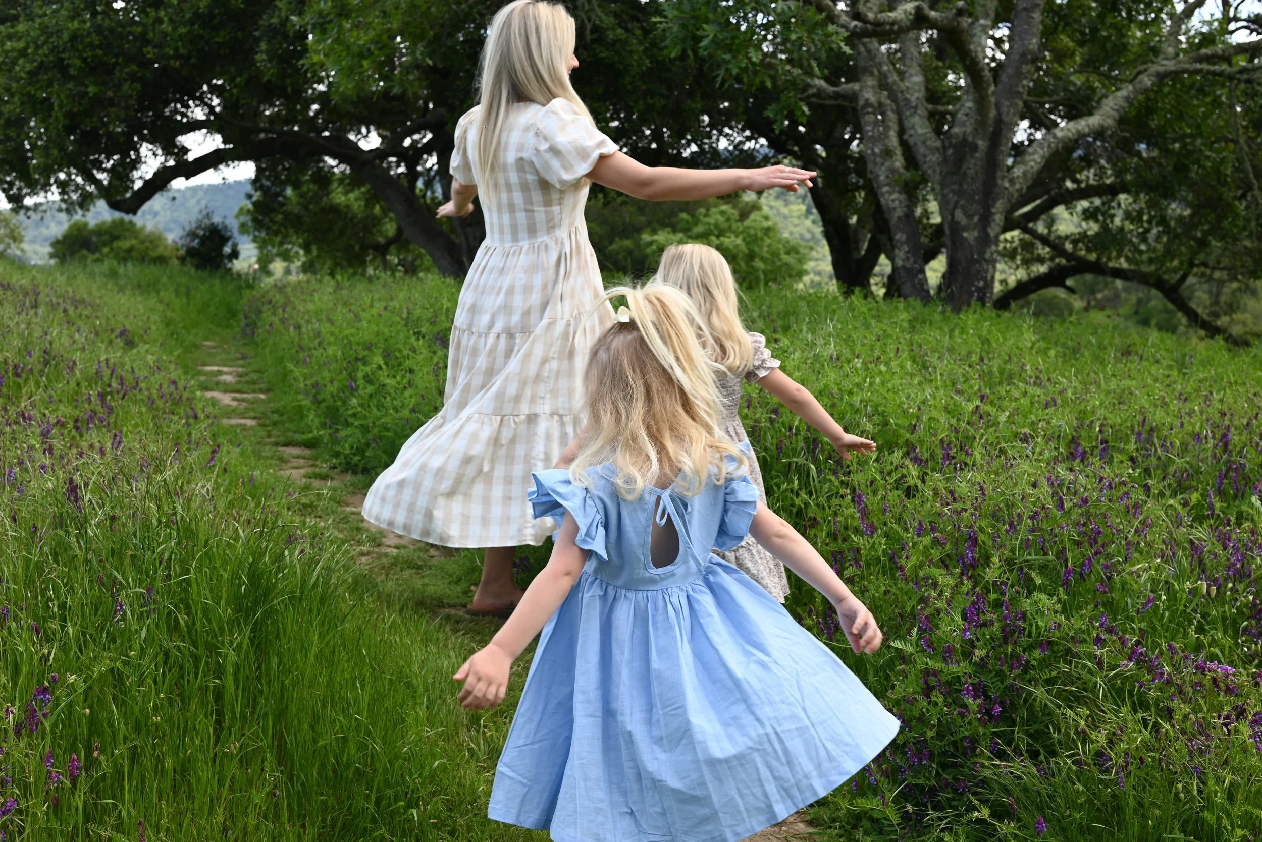 A woman and two young girls walking on a narrow dirt path through a grassy field with purple flowers, trees in the background, on a cloudy day.