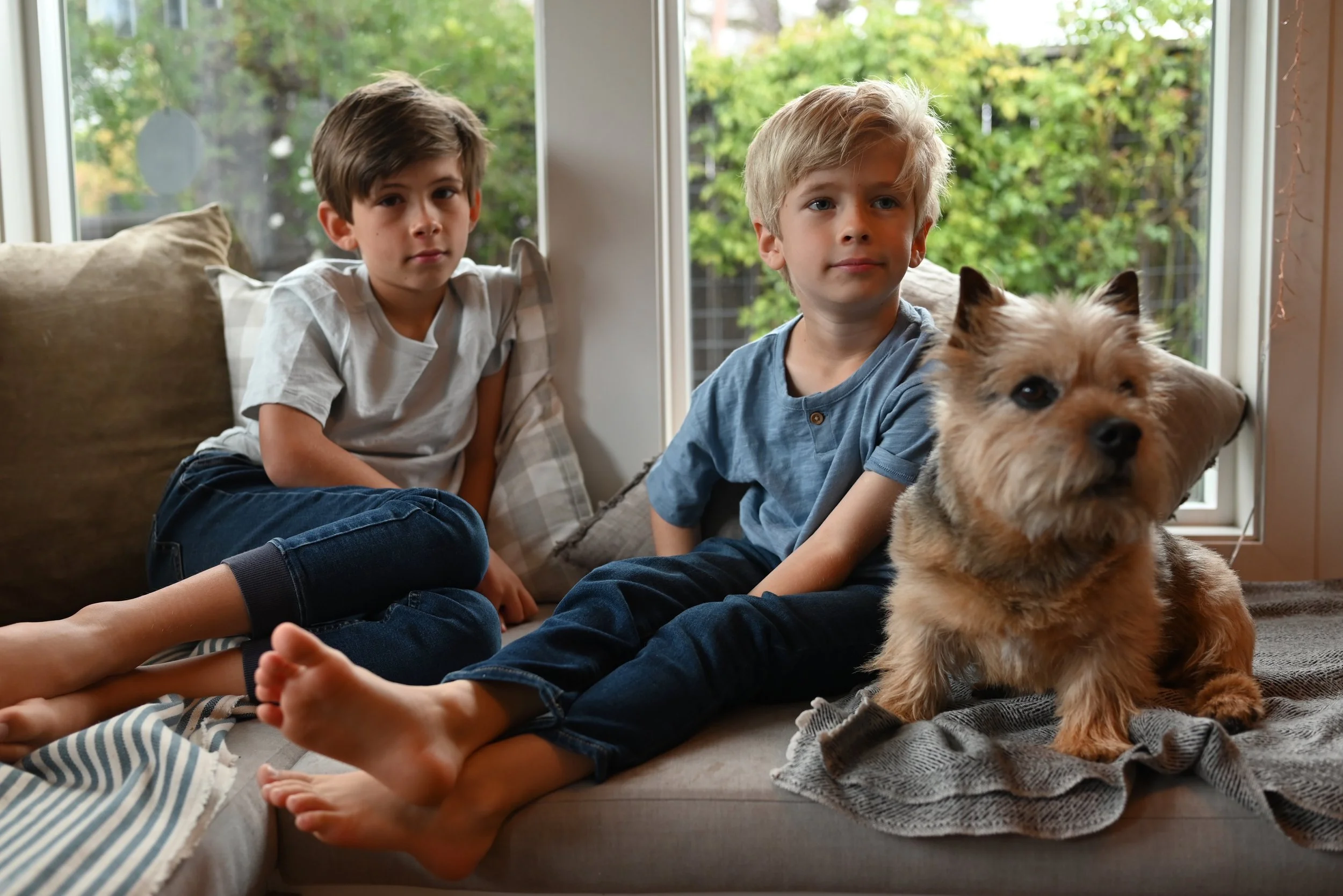 Two young boys sitting on a couch with a small dog, in front of a large window with greenery outside.