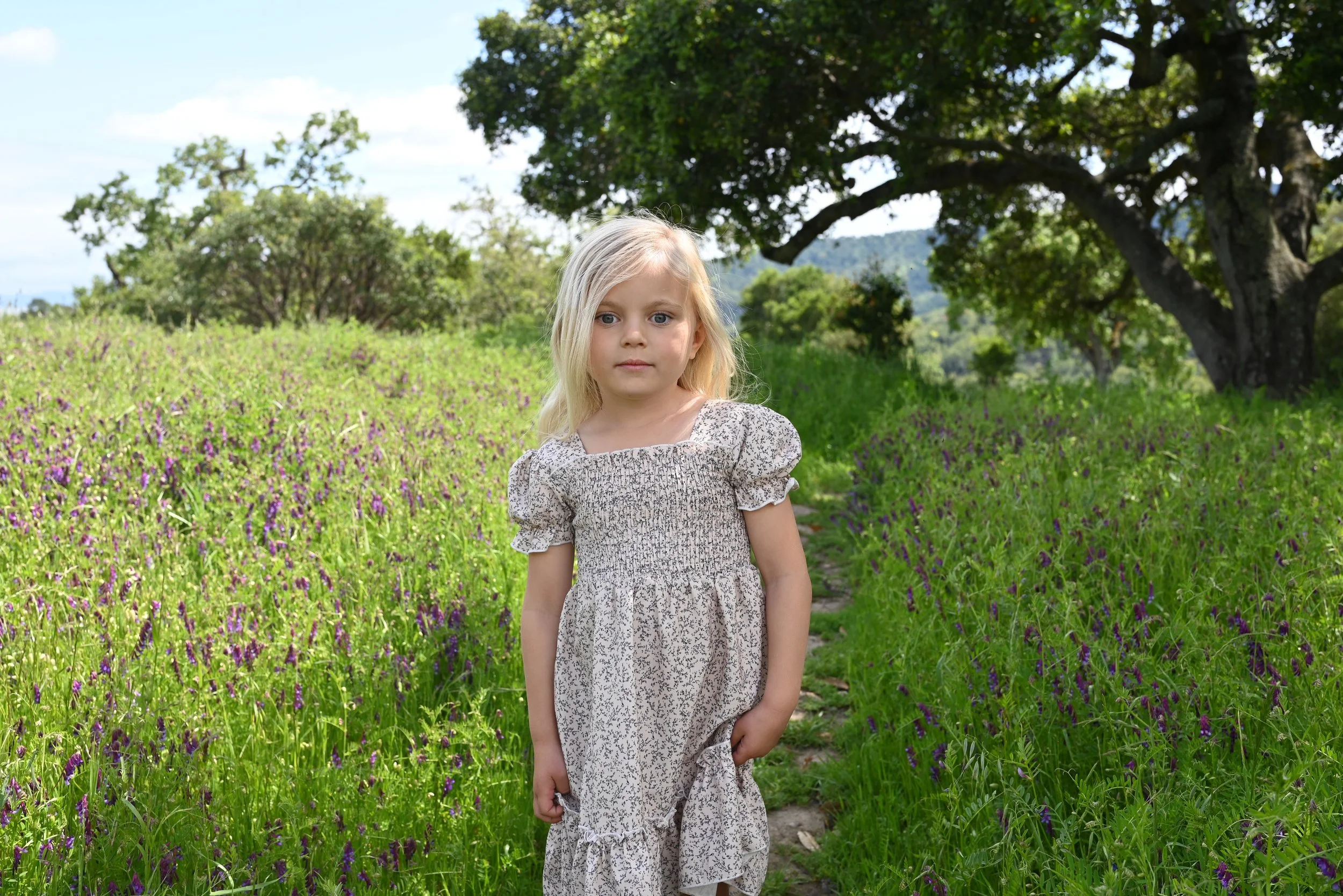 A young girl with blonde hair standing on a narrow dirt path through a field of green grass and purple wildflowers, with large trees and a cloudy sky in the background.