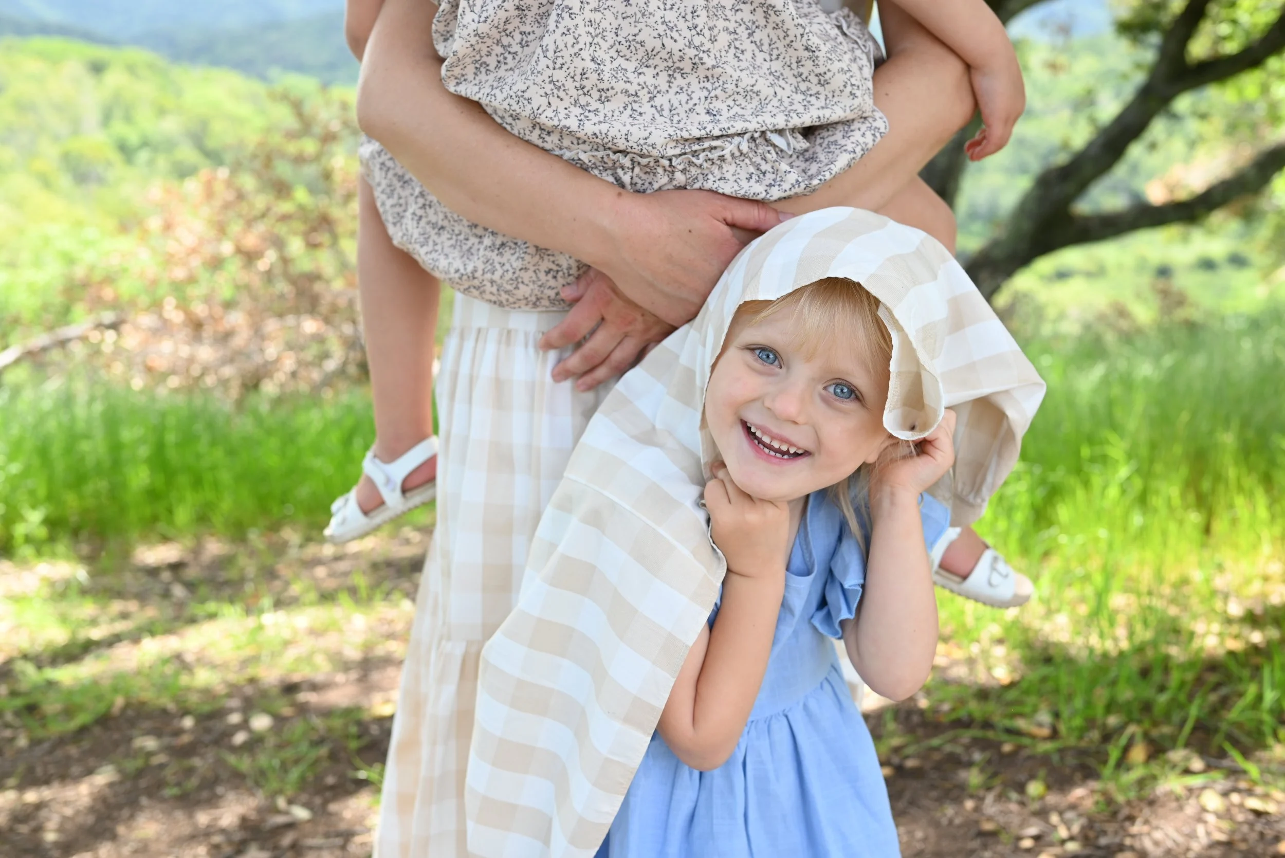 A young girl with blonde hair and blue eyes smiling, wearing a blue dress, hiding under her mother's dress, standing outdoors with a woman holding a child in the background, trees and greenery visible.