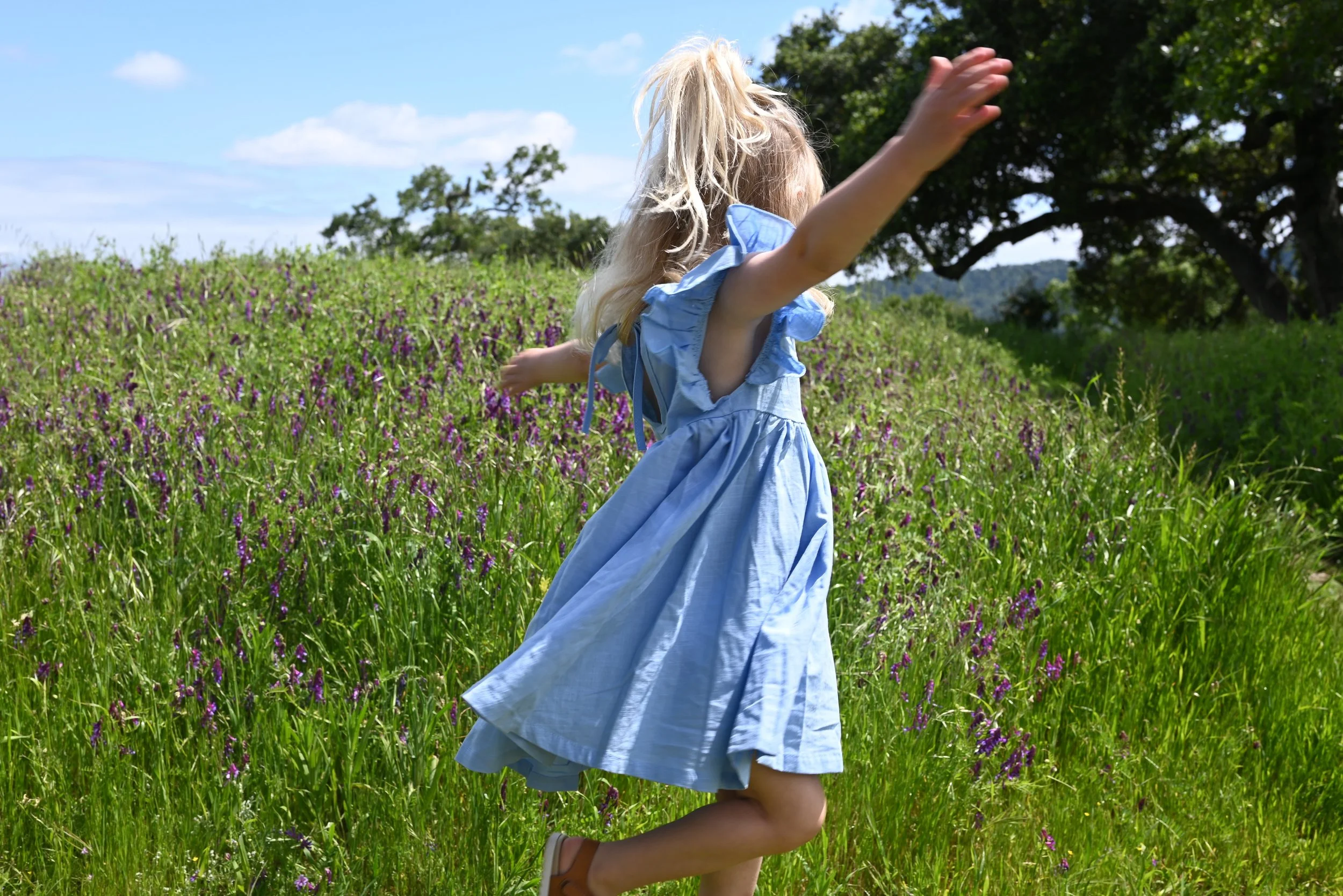 A young girl with long blonde hair wearing a blue dress is joyfully running through a green field of purple flowers on a sunny day.