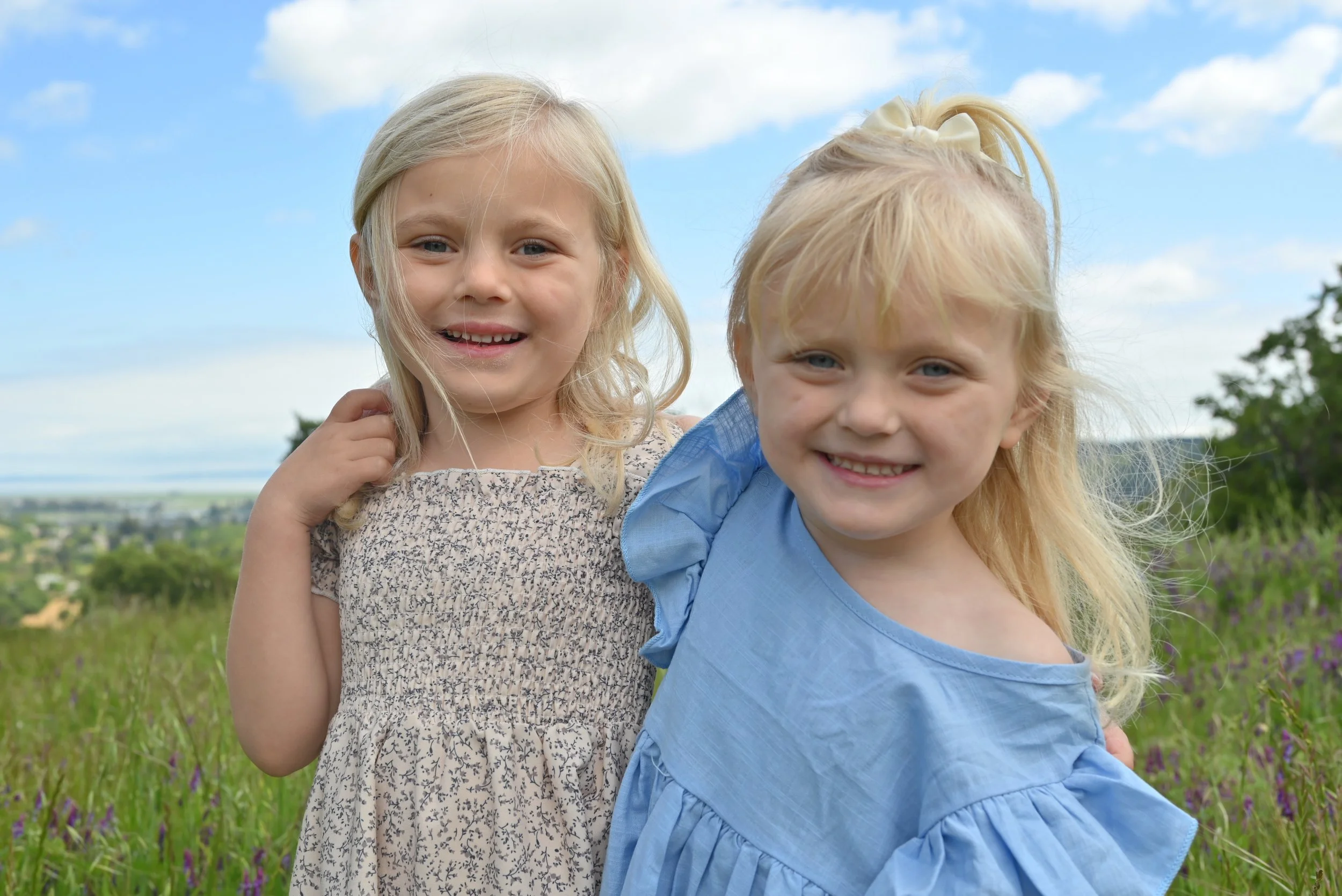 Two young blonde girls smiling outdoors in a field of green grass and purple flowers, with a blue sky and scattered clouds.