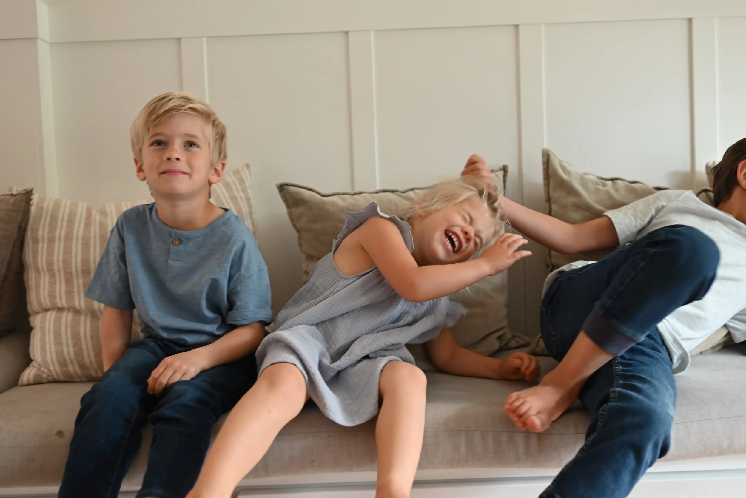 Three children sitting on a sofa, laughing and playing together.