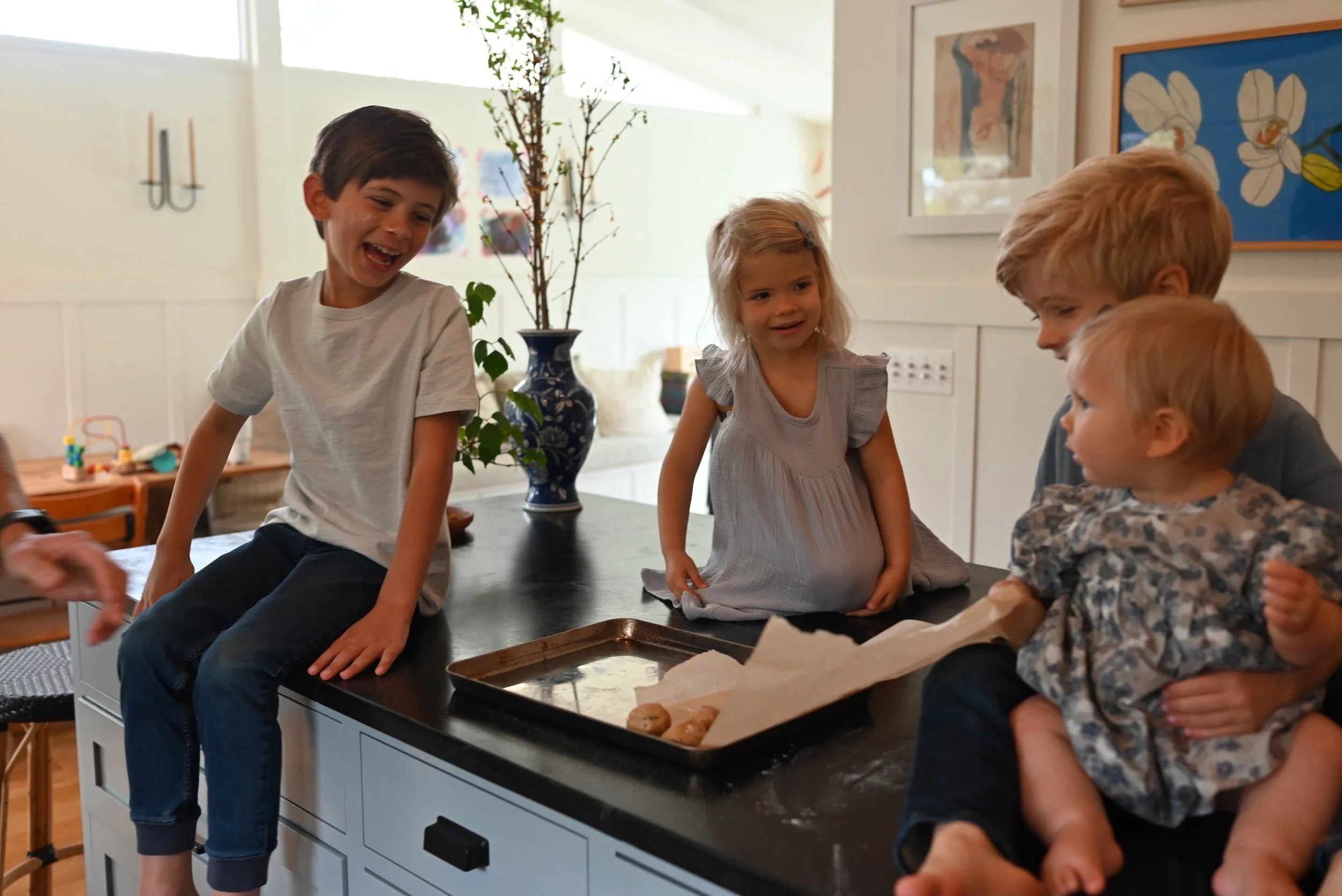Four children, two boys and two girls, are gathered around a kitchen island, smiling and interacting with each other in a bright, cozy home. One girl is sitting on the counter, and a younger girl is being held by an older boy. There is a baking tray