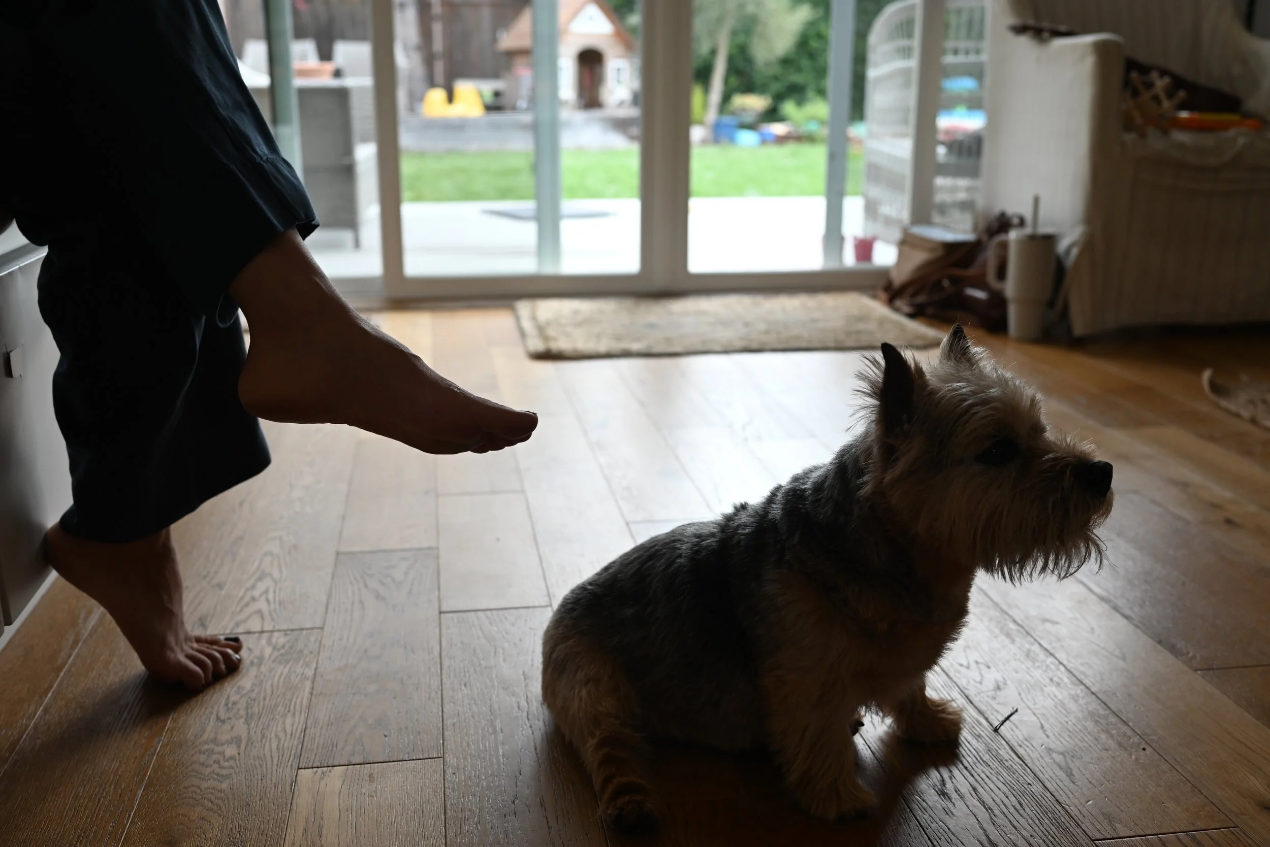 A person kneeling on one knee with their foot extended towards a small dog sitting on a wooden floor inside a house. The scene is backlit, with a sliding glass door showing a backyard with grass and outdoor furniture.