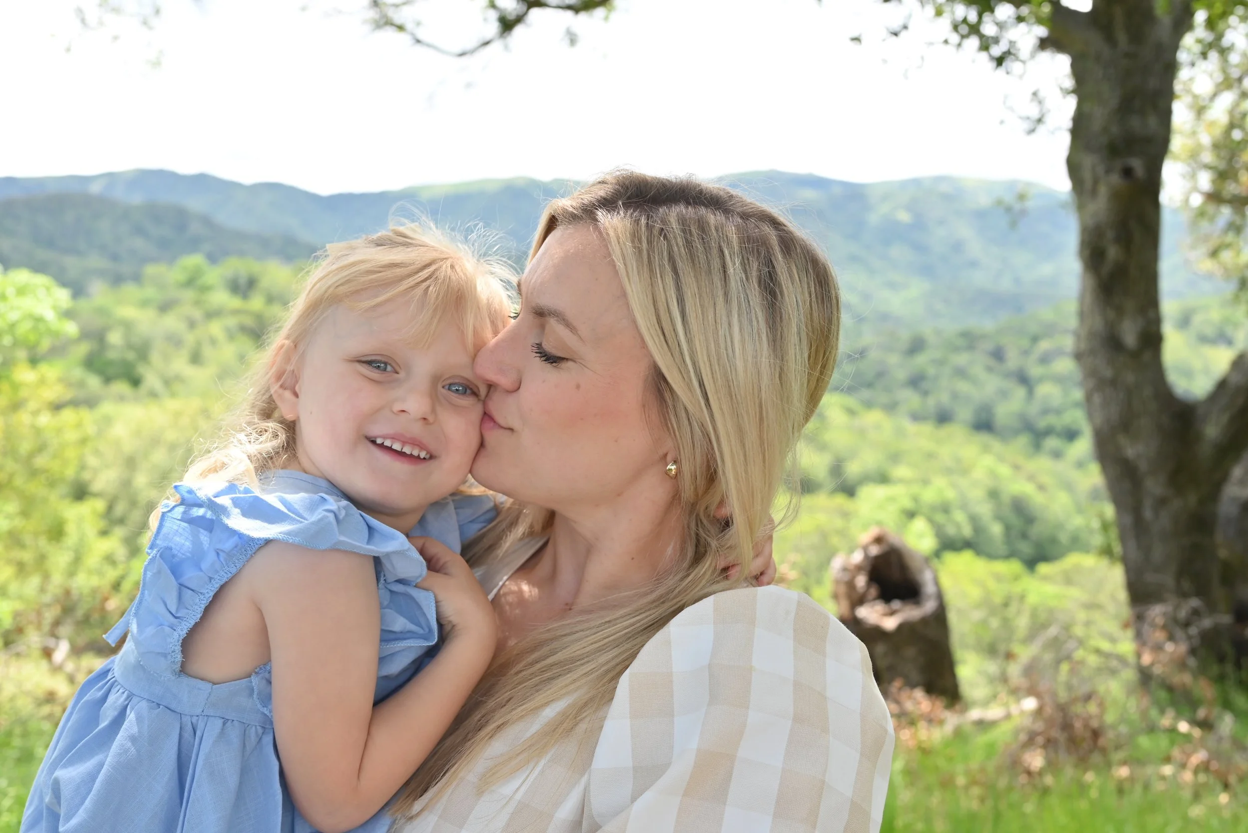 A woman with blonde hair is holding a young girl with blonde hair and blue eyes, giving her a kiss on the cheek outdoors with green trees and mountains in the background.