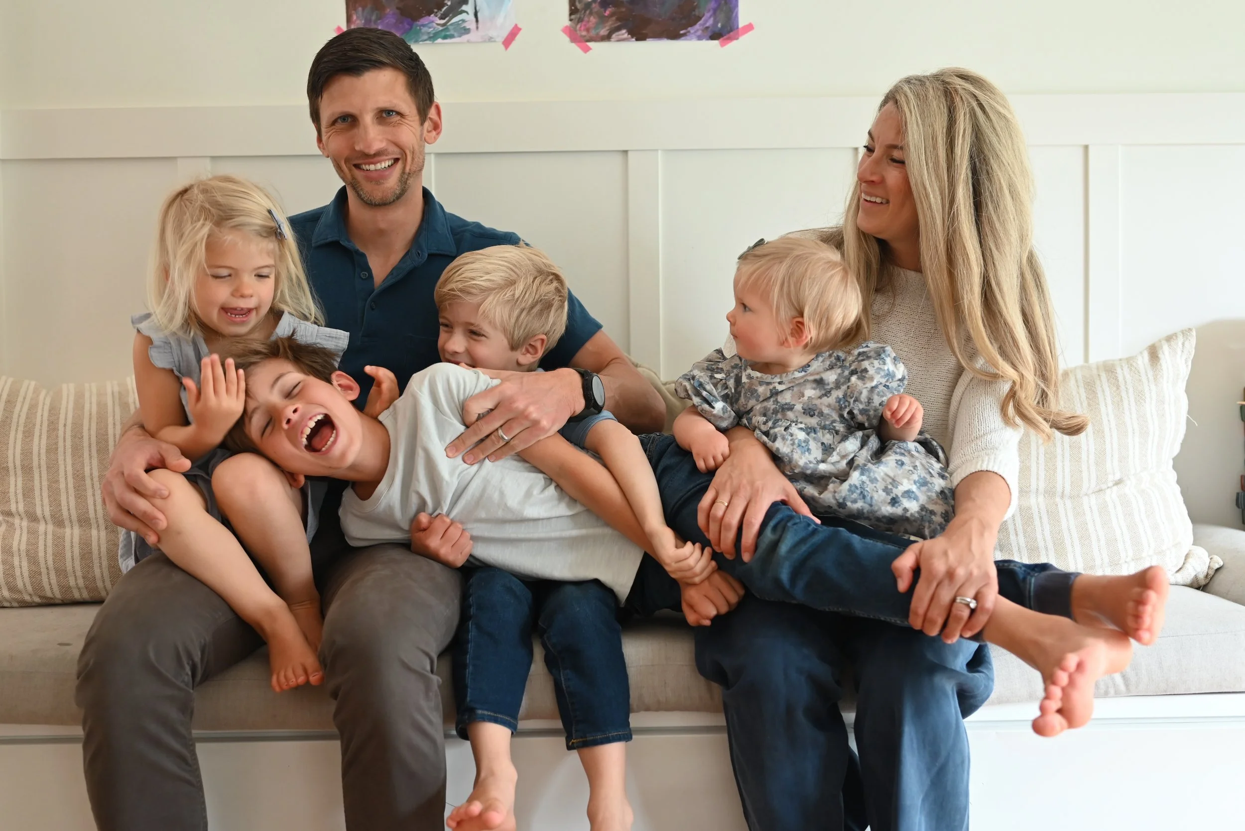 A smiling family, including two adults and four children, playfully sitting on a beige couch with a white wall and abstract paintings in the background.