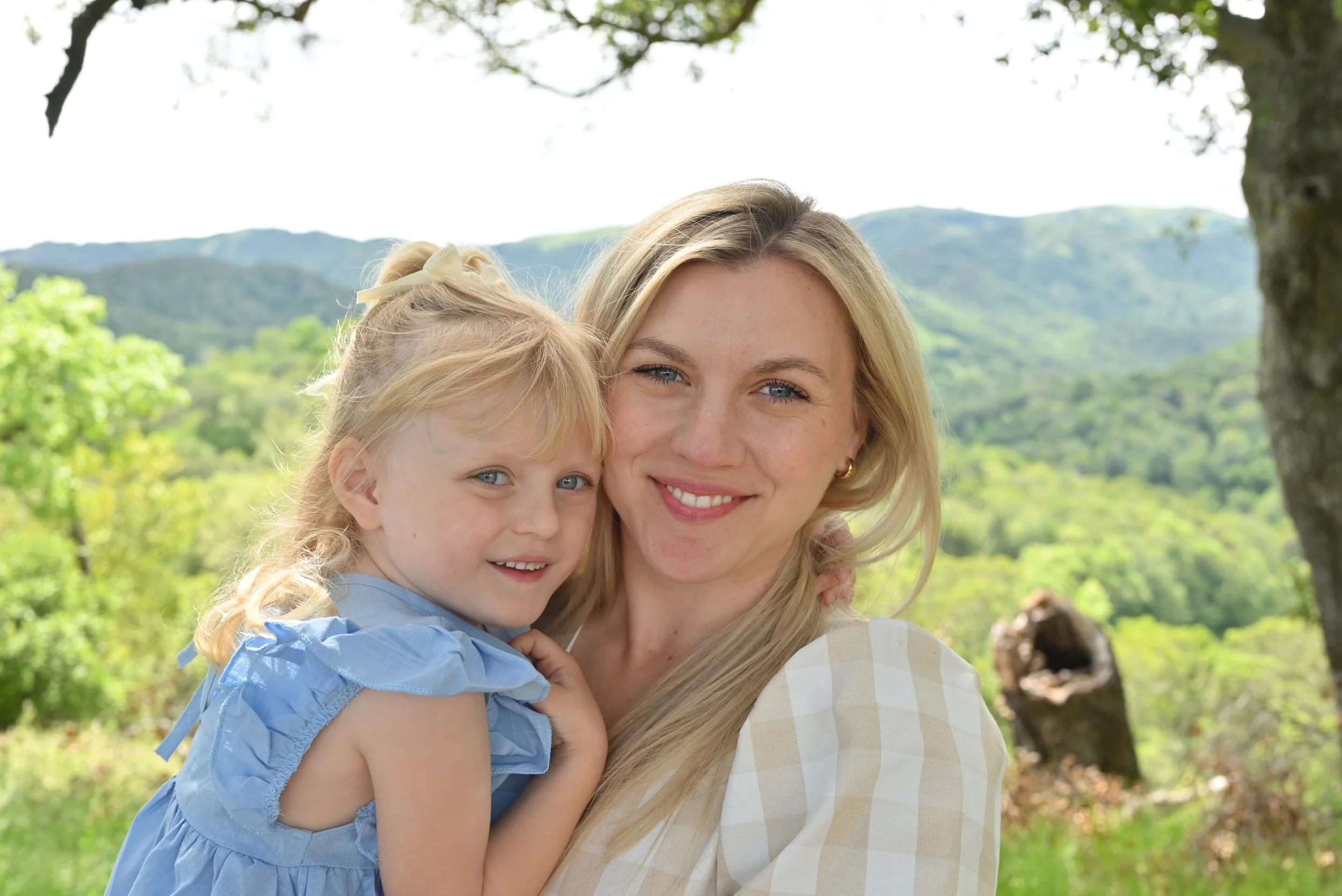 A woman holding a young girl outdoors with green hills and trees in the background.